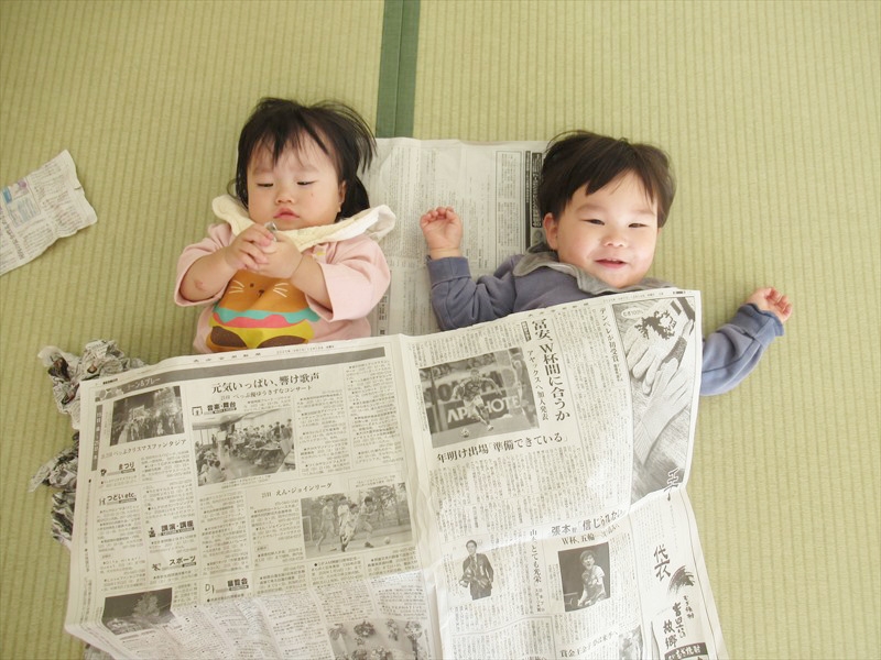 新聞紙遊びでは、指先を使ってちぎったり丸めたりして楽しんでいました。広げた新聞紙を布団の様にかけてみると、嬉しそうに友達と並んで寝転ぶ姿も見られました。