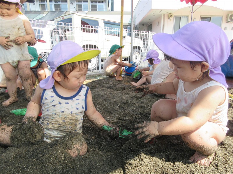 泥んこ遊びをしました。感触を嫌がることなくダイナミックに遊ぶ姿が見られました。