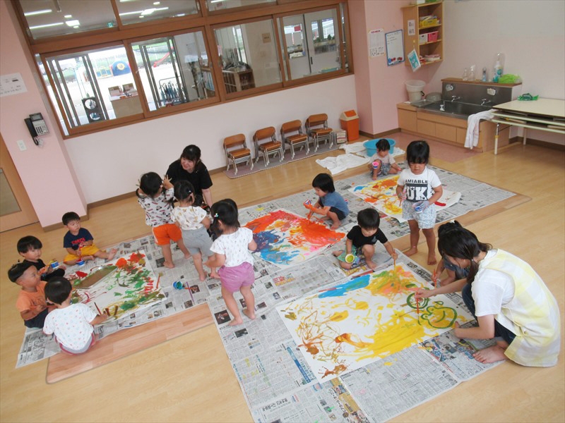 絵の具遊びをしました。筆を使って大きな模造紙に絵を描くことを楽しんでいました。徐々にダイナミックになり、途中からは手も使って描いていました。