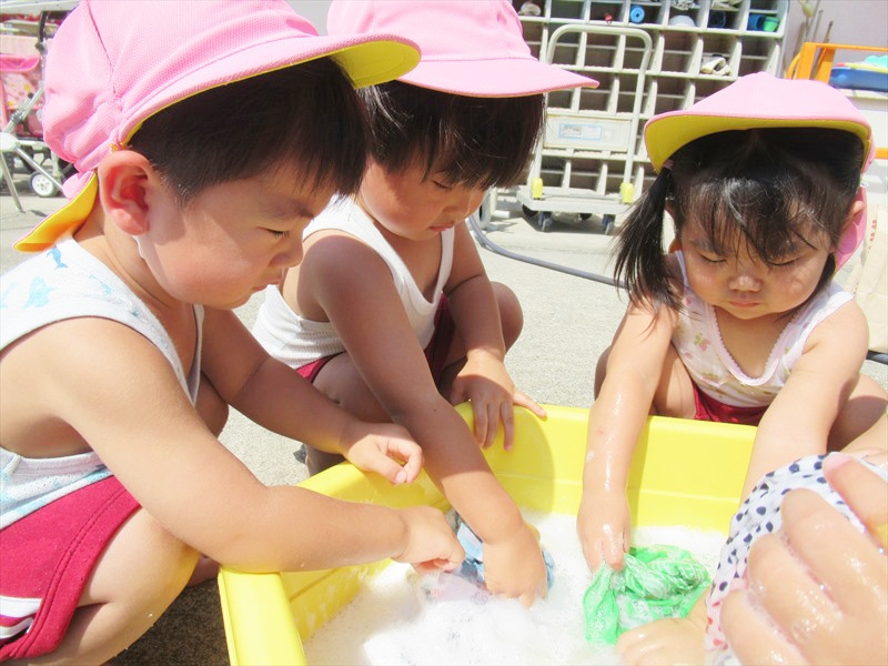 洗濯ごっこをしました。日本タオルを泡の中でゴシゴシ洗い、「綺麗になった!」「いい匂いする!」と満足気でした。