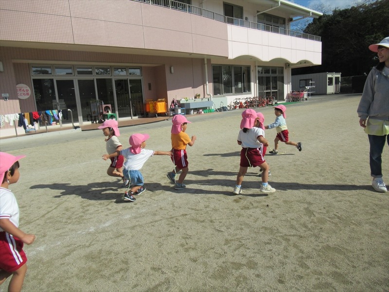 園庭でしっぽ取りをしました。すぐにルールを覚え、しっぽを取られないように必死に逃げたり追いかけたりしながら元気に走り回っていました。
