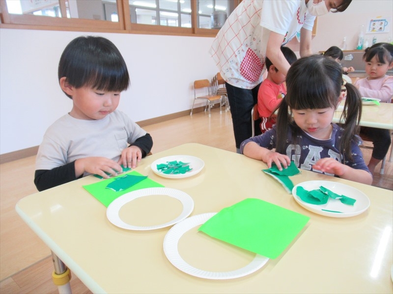折り紙を小さく破って紙皿に貼り、リースを作りました。小さくなり過ぎないように考えながら破ったり、紙皿が見えなくなるように丁寧に貼ったりして素敵なリースができました。