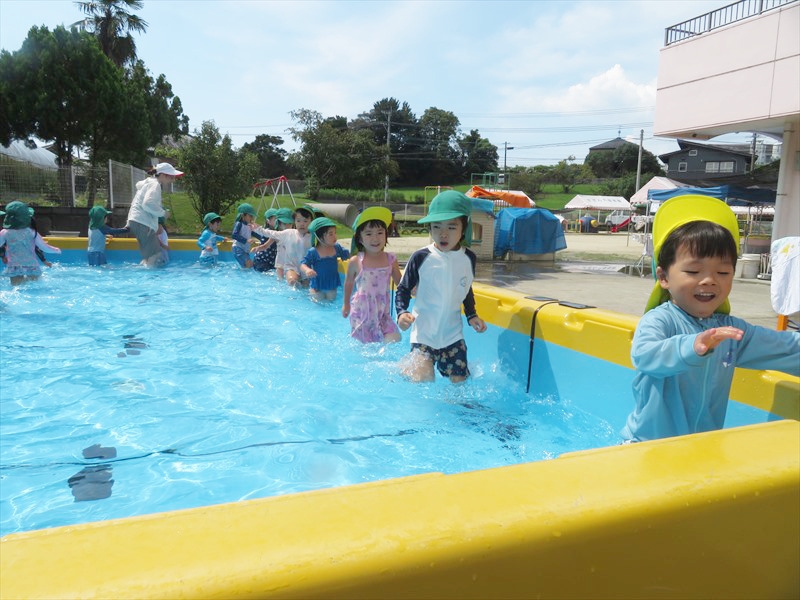 プールに入りました。プールの壁に沿って歩き流れるプール(洗濯機)を作ってます。水の中を歩くことに苦戦する子どもが多い為流れが緩やかです。