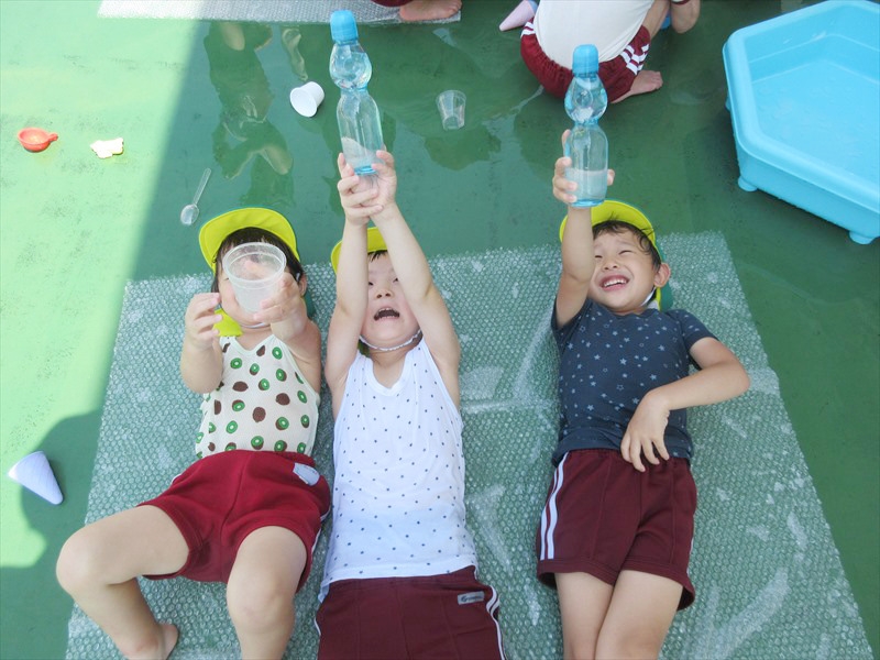 水遊びをしました。水を入れた容器を空にかかげ、「キラキラする!」と反射する様子を楽しんでいました。