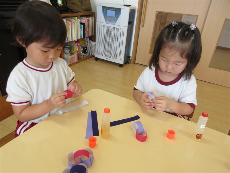 輪繋ぎをしてぶどうを作りました。作り方に苦戦する姿が見られましたが保育者や友達に聞きながら作ることができました。