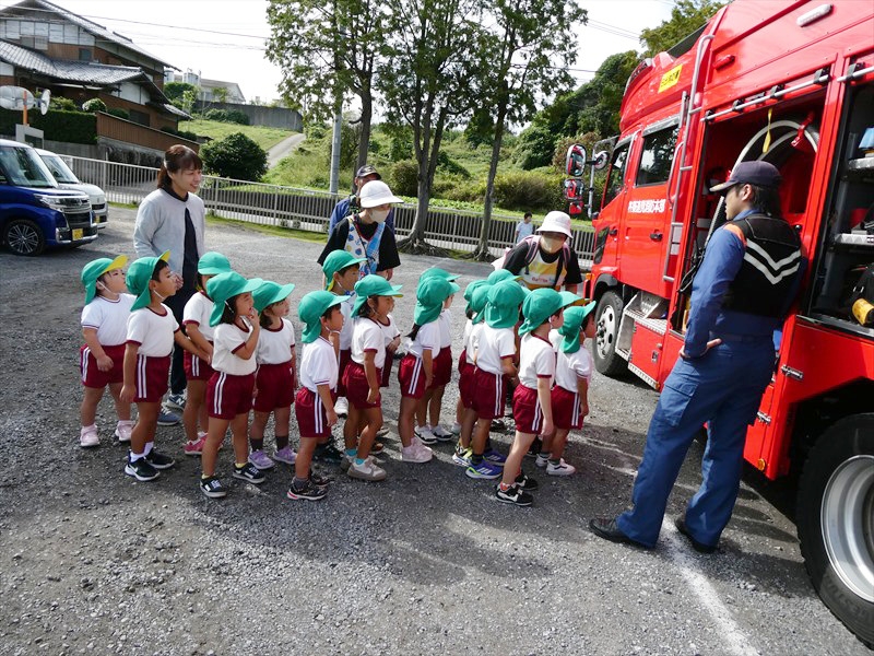 消防署立ち合い避難訓練がありました。避難訓練後に車両見学をし消防車や救急車の中を興味津々で見ていました。