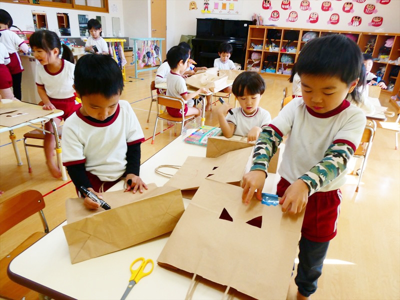 鬼のお面作りをしました。スズランテープや折り紙を使って素敵な鬼のお面を作っていました。