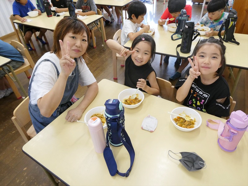 上級生を中心に保護者に手伝いをしてもらいながら、カレー作りをしました。 みんなで育てたトマト、ピーマンオクラ、ナス、ジャガイモを包丁で切り、お米は量って丁寧に研ぎました。 おかわりもしてたくさん食べました。