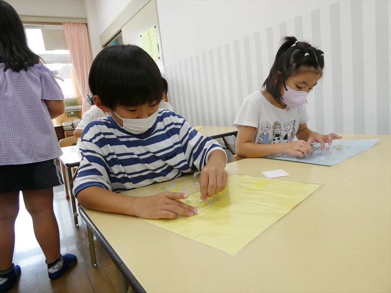 ペットボトルのフタにシールを貼り神経衰弱の要領で探す遊びをしました。 みんな一生懸命にフタをひっくり返し同じ色や模様のフタを探していました。
