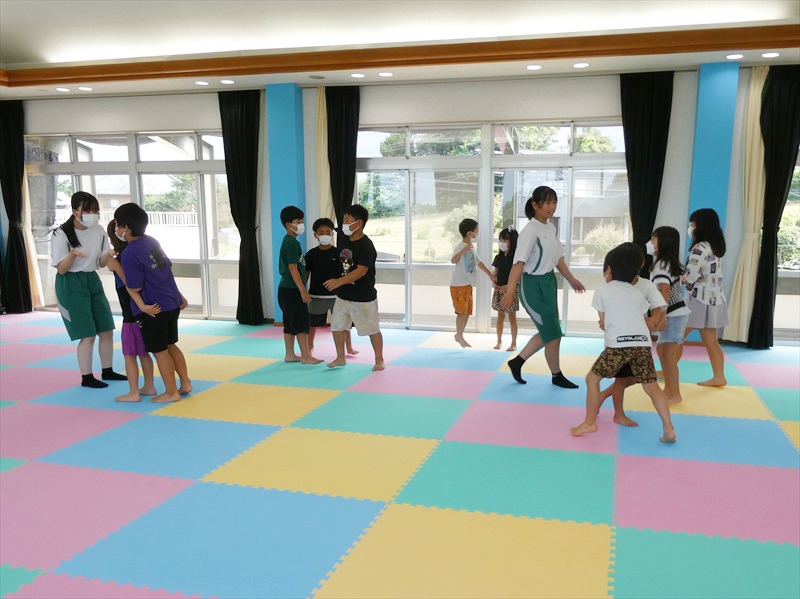 中学生がいろいろな遊びを考えてくれ、一緒に遊びました。 フープくぐりや仲間集め、箱の中身はなんだろうななど、友達だけでなく中学生とも会話を楽しみながら遊ぶことができました。