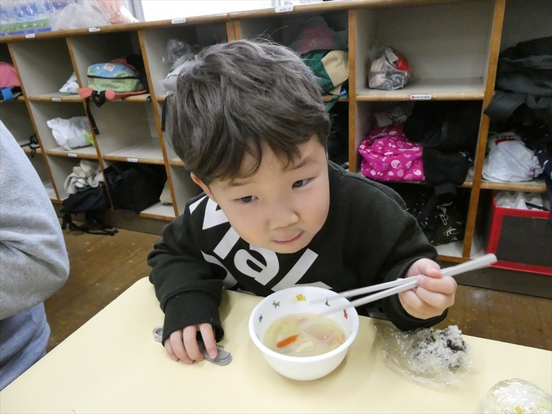 新年に向け、大掃除をしました。 普段使っている机の汚れを消しゴムで消したり、椅子の脚裏の溝の汚れをつまようじで取ったりしました。 本棚掃除では、全部本棚から本を出し1冊ずつ丁寧に拭ききれいに並べました。 大掃除を頑張ったご褒美で、昼食時に保護者の方が作った豚汁を食べました。 「温かくておいしい」と喜び、おかわりもたくさん食べていました。