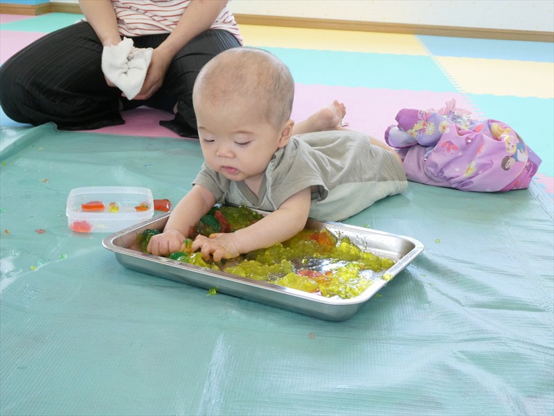 寒天遊びをしました。 冷たい寒天を触ったり握ったりスプーンですくったりしながら思い思い遊んでいました。 「冷たいね」「きれいだね」「気持ちいいね」とお母さんや友達と話したり表情で伝えたりしながら時間いっぱい楽しんでいました。
