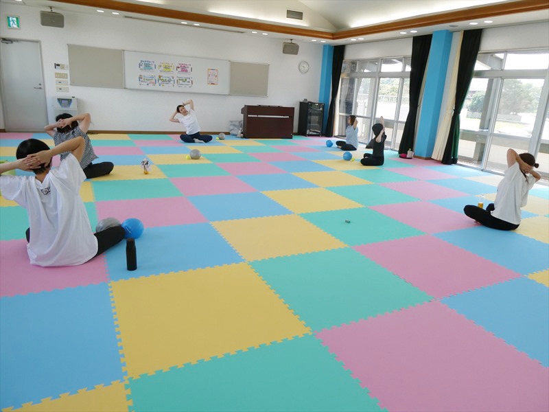 毎回参加者が多い、人気のピラティス。 お子さんと離れ、しっかり体を動かしてリフレッシュしていました。