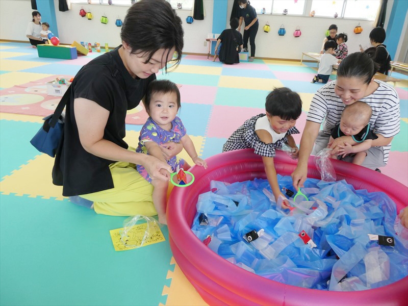 こども園で各年齢のクラスに行き0歳児はボール、2歳児は袋で遊びました。 初めての場所で緊張している姿が見られましたが少しずつ慣れ、活発に動いて遊んでいました。 園内の見学、給食の試食も行いました。