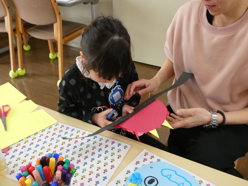 2月は足形で鬼を作りました。 足裏の絵の具や紙に押した足形に興味を持ち見ていました。 製作の後は、ブロックや滑り台で遊びながら、楽しい時間を過ごしていました。