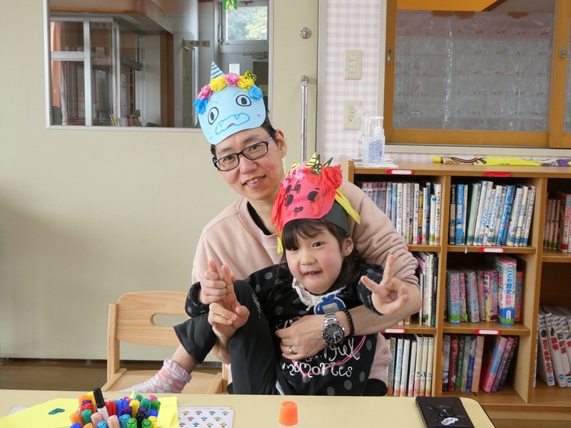 大型絵本では指差ししたり、ニコッと笑ったりしながら楽しんで見ていました。 製作でモンスターを作りました。 クレパスでなぐり描きをしたり糊で目や角などを貼ったりしました。個性豊かなモンスターができていました。