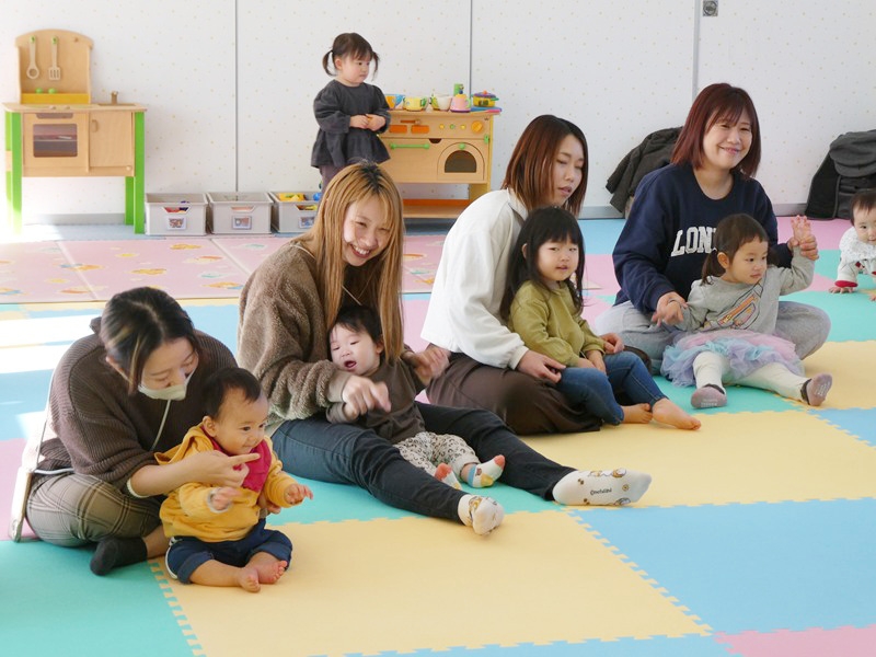 読み聞かせでは、子どももお母さんも集中して見ていました。 ふれあい遊びでは、音楽に合わせてお腹や足などいろいろな所を触ってもらいながら楽しく過ごしていました。
