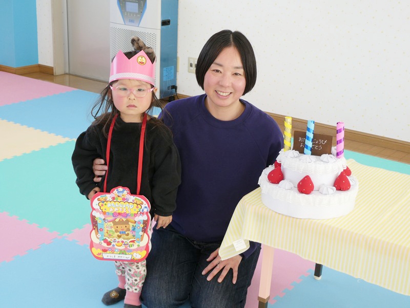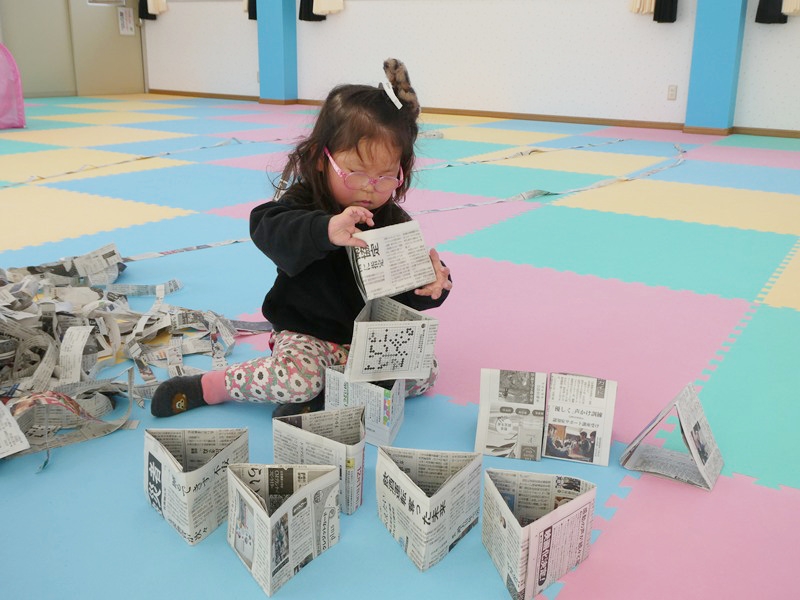 新聞紙で遊びました。 同じ形をたくさん作り、積み重ねたり並べたりしながら集中して遊んでいました。 1月生まれの誕生会をしました。 緊張しているようでしたが、ろうそくを立ててケーキを完成させていました。