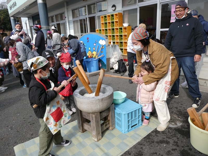 小さいお友達もお家の方と一緒におもちをついたり、丸めたりしました。 初めての体験に戸惑っている子どももいましたが、楽しそうに過ごしていました。 つきたてのおもちも口いっぱいほおばって食べていました。