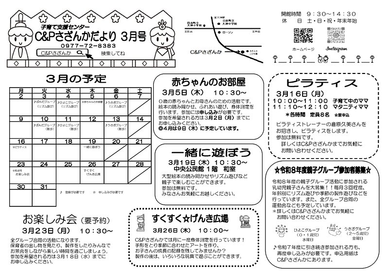 引き続き乳幼児のグループ活動やすくすくげんき広場、赤ちゃんのお部屋などの活動を行います。