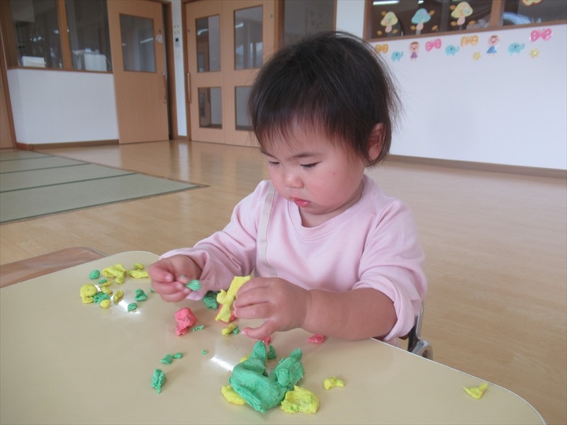 小麦粉粘土で遊びました。食紅で色を付けた粘土に興味津々で、指先を上手に使いながらちぎったりくっつけたりして集中して遊んでいました。