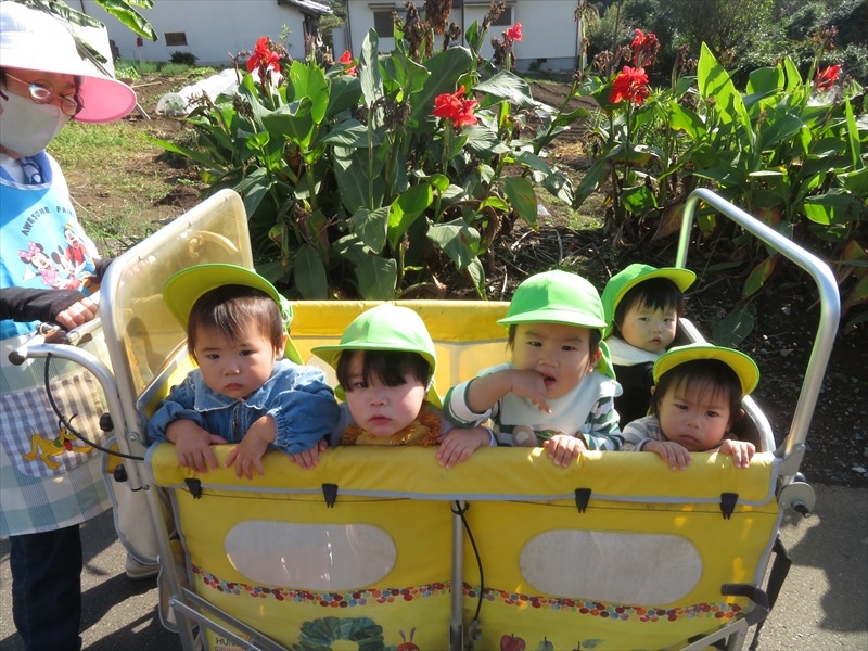 避難台車に乗って散歩に行きました。花や木の実などを見つけると指をさして知らせたり、時々台車から降り保育者と手をつないで歩いたりしながら自然に触れることや歩くことを楽しんでいました。
