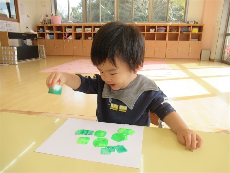 緑色のスタンプを押して、クリスマスツリーを作りました。スポンジをしっかりと握り、色が付く様子を楽しみながらたくさん押していました。