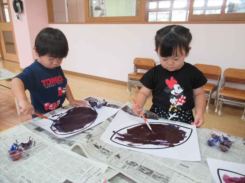 自分で青と赤の絵の具を筆で混ぜ、芋を描いた画用紙に塗りました。塗っているときの表情は真剣そのもの。大きな芋の端から端までとても丁寧に塗ることができました。