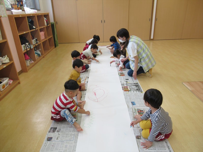 大きなロール紙にみんなでお絵描きをしました。好きな色のクレパスを選び、ギザギザの草を描いたり顔を描いたりしながら友達や保育教諭に嬉しそうに見せていました。