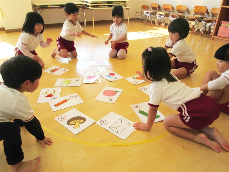 大型かるたで遊びました。保育教諭が読み札を読むと「あった!」と叫びながら、見つけたかるたに飛びついていました。