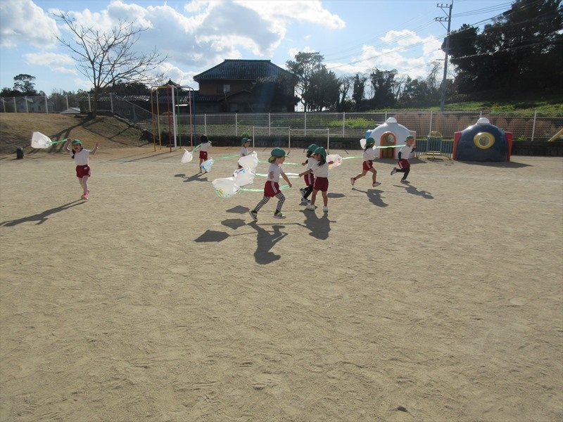 シャボン玉をしました。力一杯吹く姿が見られ、シャボン玉がたくさん飛んでいくと追いかける姿も見られました。