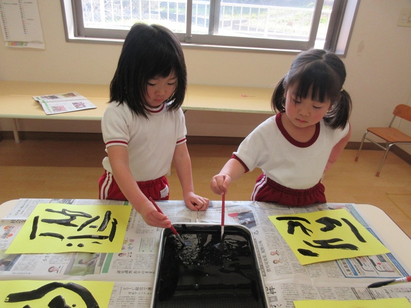 絵の具と筆を使って、鬼のパンツを作りました。筆にしっかり絵の具を付け「しましまパンツ、難しいなぁ」と話しながらそれぞれ個性のあるパンツを完成させていました。
