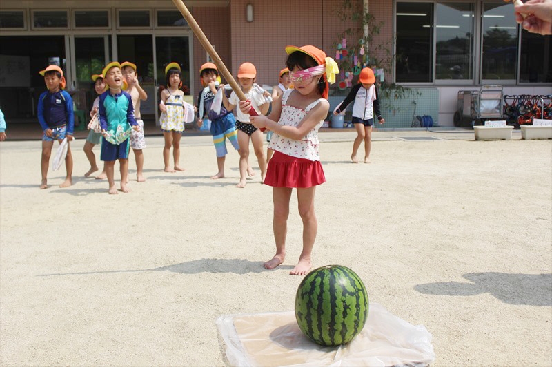 すいか割りをしました。「右!」「そこ違う!」「頑張れ!」と応援する子どもたちにも熱が入っていました。無事に割れたすいかをおいしく食べました。