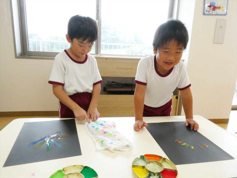 指を使って絵の具で花火を作りました。自分で色の配色や花火の形を決め個性的な花火ができました。