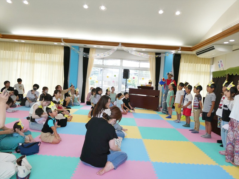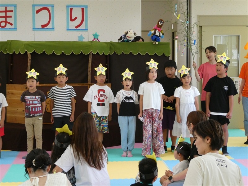 「たなばたさま」や「アンパンマンのマーチ」の歌や楽器演奏を披露しました。 緊張している子どももいましたが、元気よく歌うことができました。