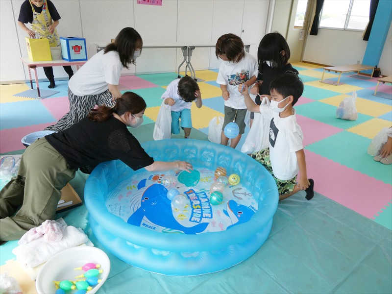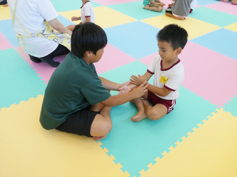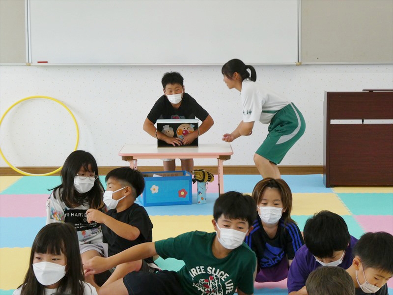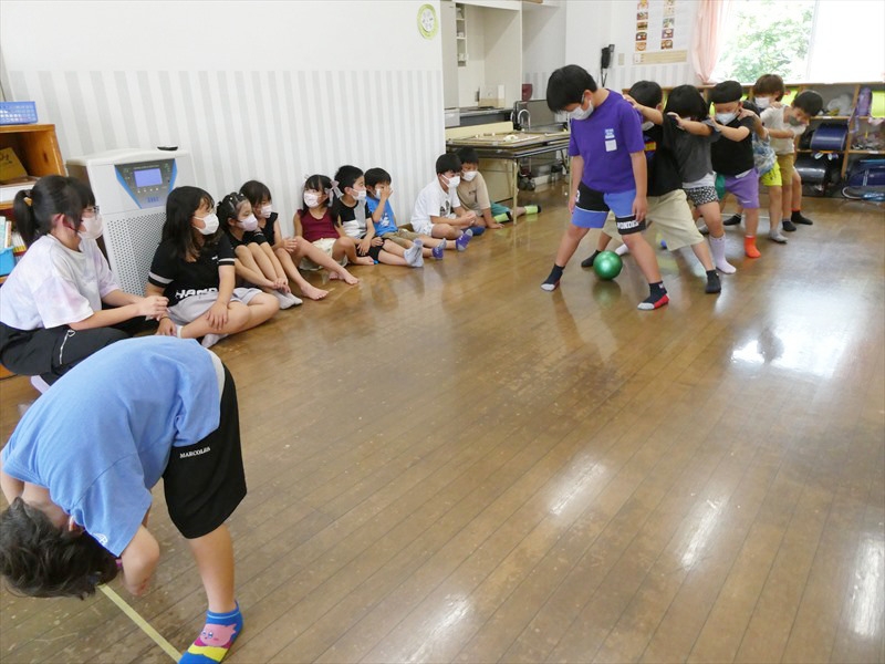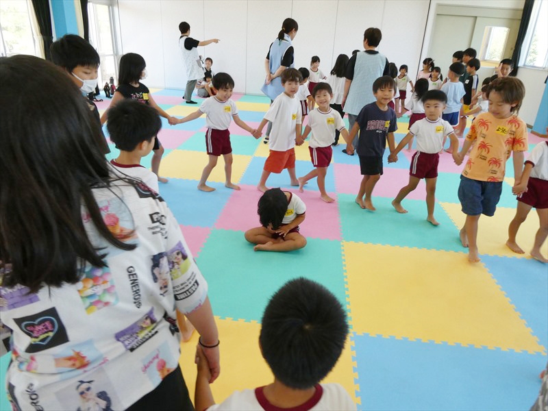 中学生がいろいろな遊びを考えてくれ、一緒に遊びました。 フープくぐりや仲間集め、箱の中身はなんだろうななど、友達だけでなく中学生とも会話を楽しみながら遊ぶことができました。