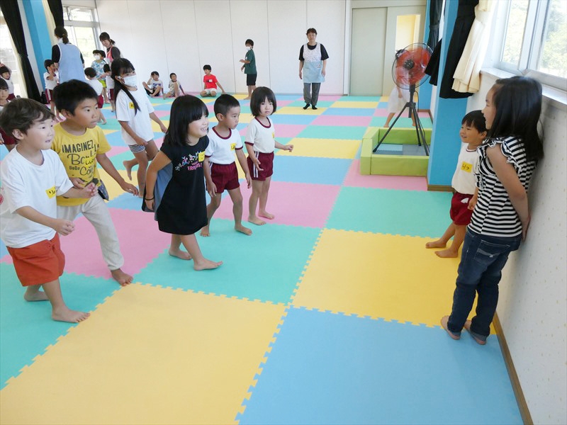 チームに分かれ、巨大オセロをうちわでひっくり返す遊びをしました。 なかなかうまくひっくり返せず時間がかかってしまう子どももいましたが、友達の声援を受け最後まで頑張ることができていました。