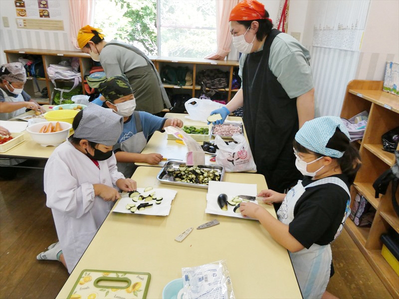 上級生を中心に保護者に手伝いをしてもらいながら、カレー作りをしました。 みんなで育てたトマト、ピーマンオクラ、ナス、ジャガイモを包丁で切り、お米は量って丁寧に研ぎました。 おかわりもしてたくさん食べました。