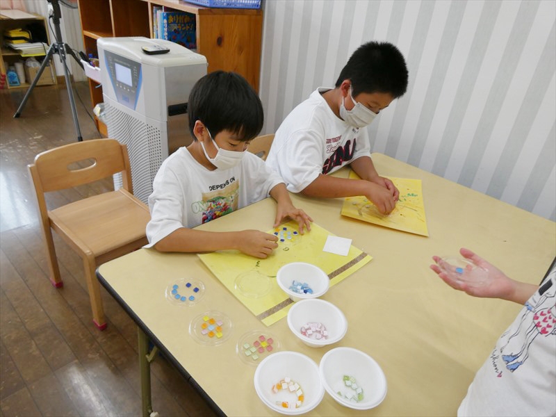 タイルを使ってコースター作りをしました。 「何色がいいかな」「どんな模様にしようかな」などいろいろ考えながらタイルを選んでいました。