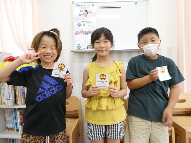 低学年と高学年に分かれて遊びました。 ルールは引いたカードに書かれた数字を足した数が大きかった方が勝ち。 低学年は指を使いながら、高学年は暗算で答えを出していました。 周りの友達の数字を気にしながら自分の足した数を言い一番数の多かった子どもは「やったー!」と喜んでいました。