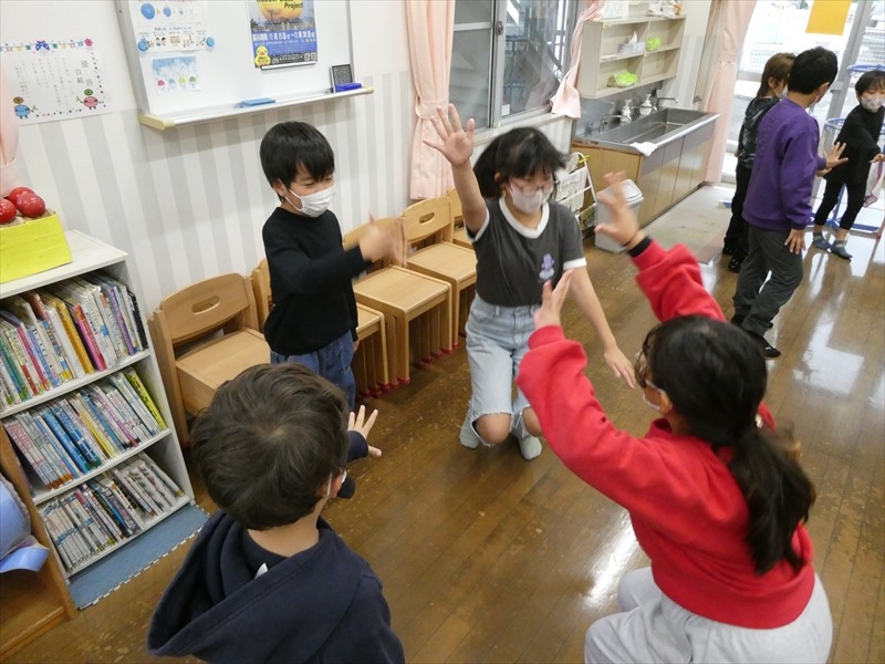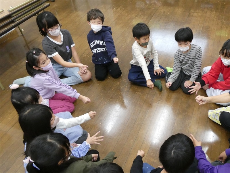 5歳児は「あんたがたどこさ」の歌に合わせてボディタッチをしました。 最後はみんなで記念撮影をしました。 「楽しかったね」「また一緒に遊ぼうね」など子ども同士で会話を楽しむ姿も見られました。