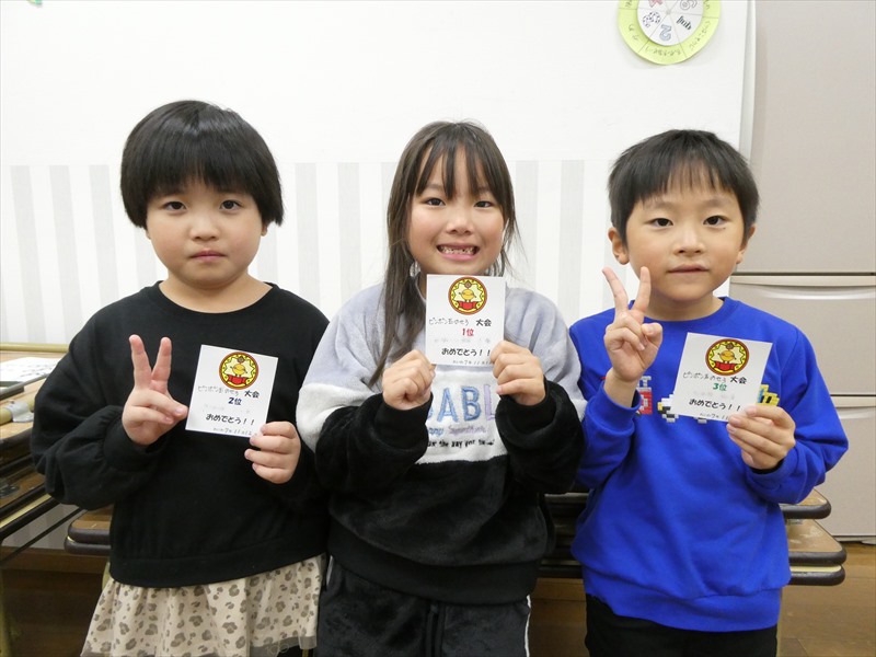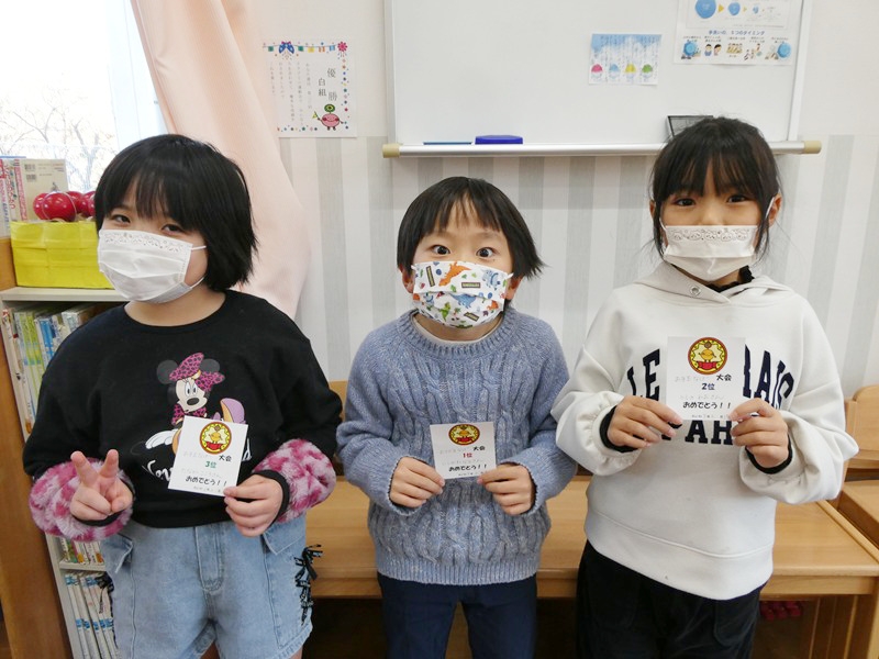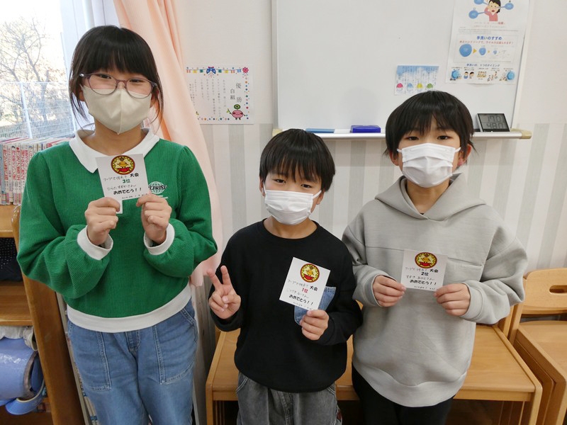学年混合で2チームに分かれて、お題と同じ文章を作っていく遊びをしました。 たくさんの文字カルタから必要な文字を探してどちらが文章を先に作れるか競いました。 どちらのチームも上級生を中心に頑張って文章を作っていました。