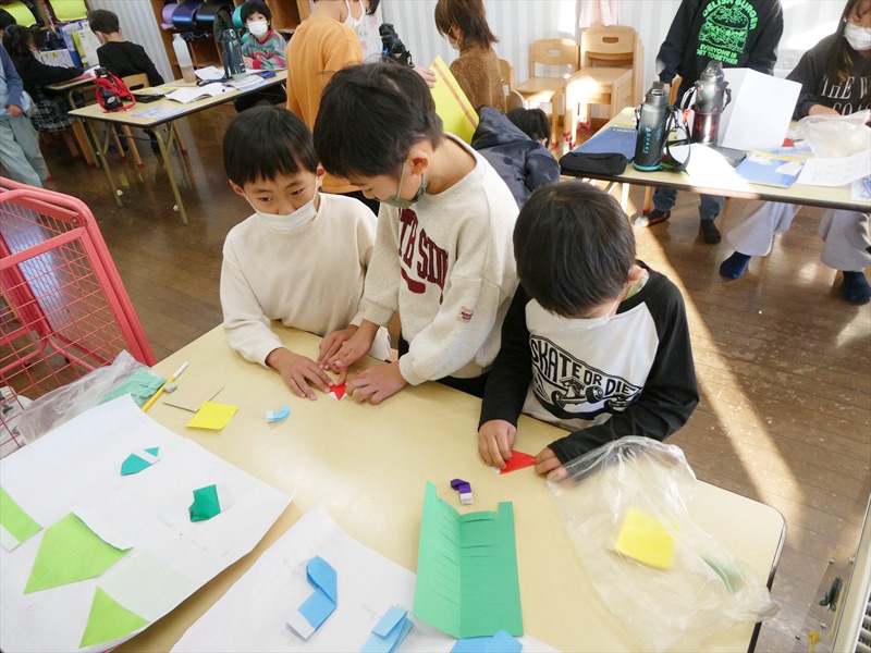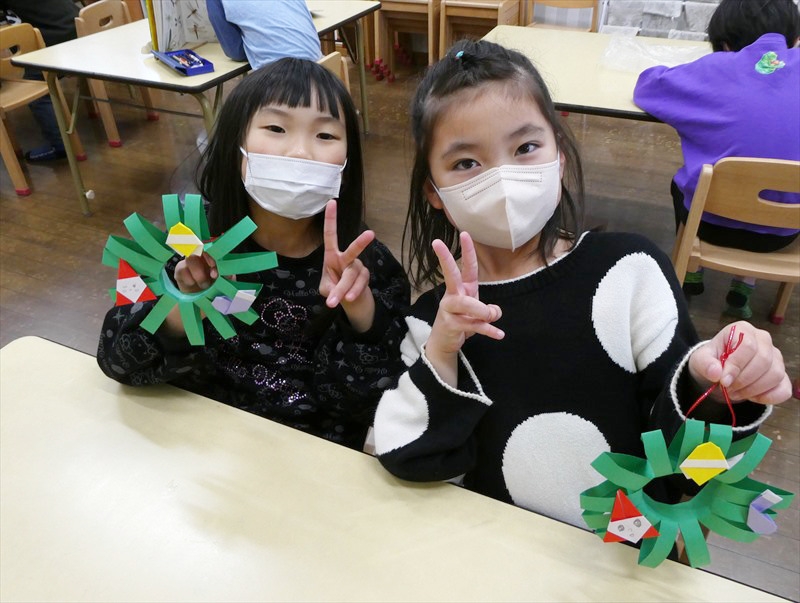 折り紙でサンタさんやブーツを折ったり、画用紙に切り込みを入れてリースを作ったりし、壁飾りを作りました。 作り方を聞くと集中して作っていました。