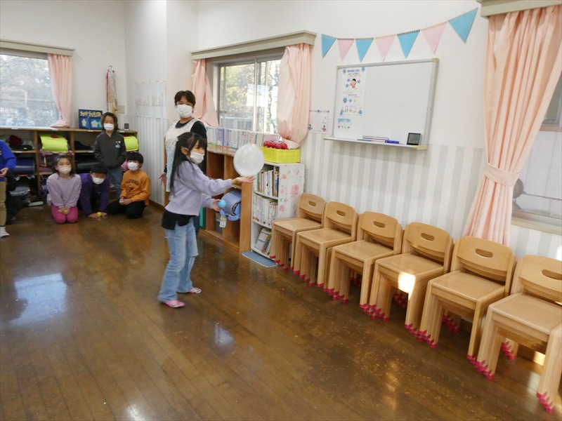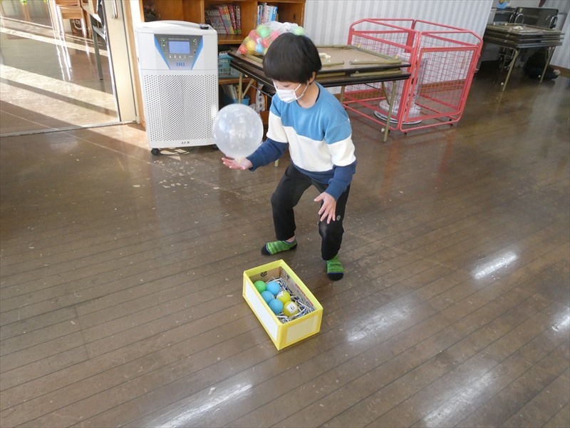 2チームに分かれ、風船を落とさないように進み、箱に入っているボールをとり次の友達と交代していきました。 落とさないように集中しすぎて隣の部屋まで行ってしまう子どももいましたが、楽しく遊ぶことができていました。