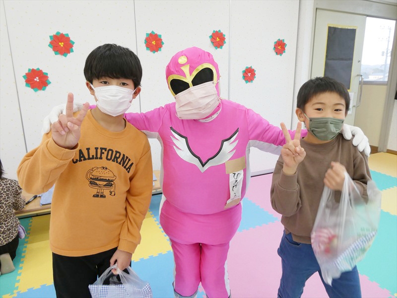 班に分かれてゲームをしたり、職員の出し物を見たりビンゴゲームをしたりしました。 途中、謎のゲストも出演し子ども達は大盛り上がり!一緒にクリスマス会を盛り上げてくれ楽しい時間を過ごしました。