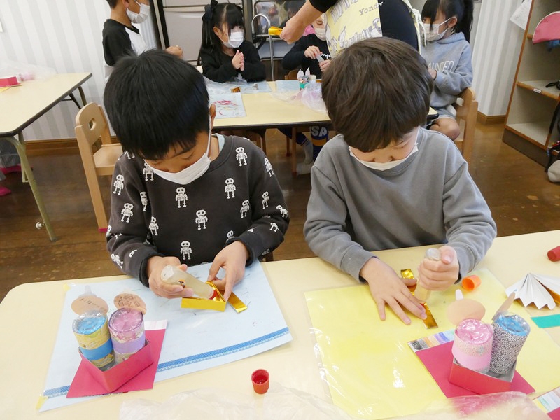 芯についたヒモを巻き取り、芯の上にピンポン玉をのせて机に立たせる競争をしました。 なかなか巻き取れないヒモに苦戦しながらも最後まであきらめることなく頑張っていました。