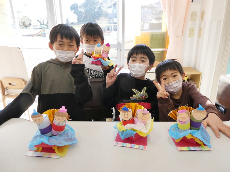 小さいペットボトルを使い、ひな飾りを作りました。 お花紙をペットボトルに入れ、画用紙を切って顔を描き貼りました。 個性豊かな表情のひな飾りができました。