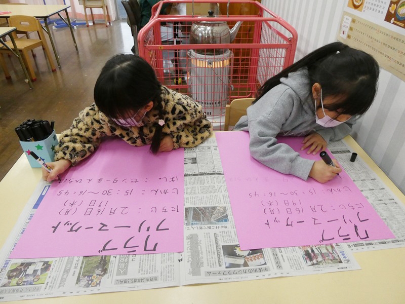 2月に行うフリーマーケットの準備を始めました。 看板の文字を友達と確認しながら書いていました。 たくさんのお客さんが買いものに来てくれるように品物作りも頑張っています。
