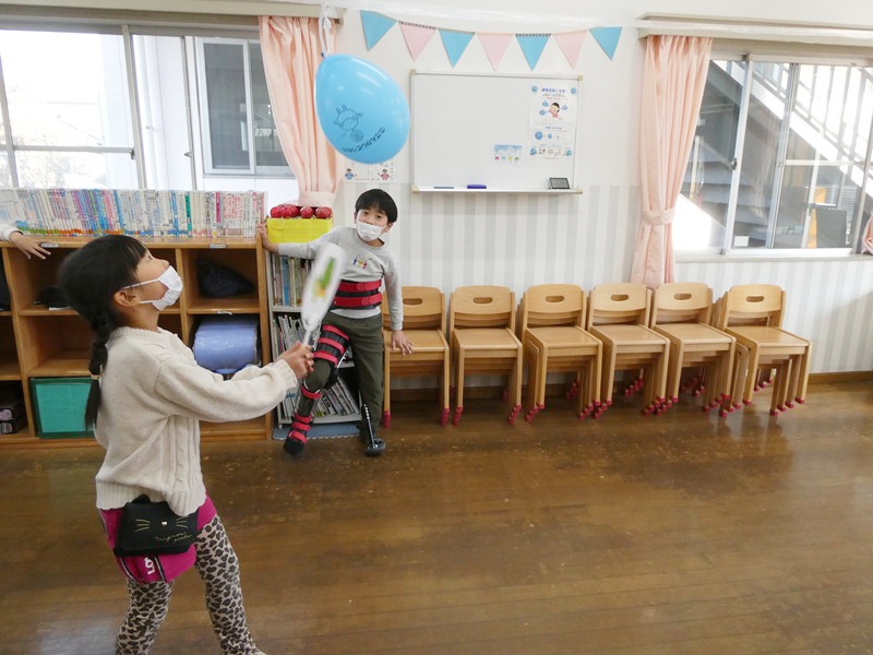 ヒモに吊るされた風船をうちわであおいで移動させていく遊びをしました。 ふわふわ浮かぶ風船がなかなか思うように進まず苦戦していましたが、最後まで諦めずに頑張っていました。