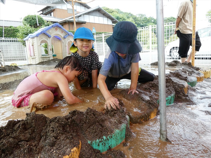 どろんこ遊びをしました。 友達やお家の人と協力して穴を掘ったり囲いを作ったりして遊んでいました。 時間になっても遊び足りないくらい楽しんでいました。
